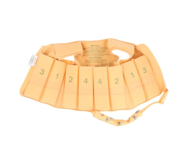 Este chaleco dispone de 8 compartimentos donde cada uno de ellos tiene 3 elementos de flotabilidad. Total 24. Esos elementos son los que se pueden quitar poco a poco para que el niño/a mejore su capacidad de flotar sin ayudas.