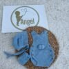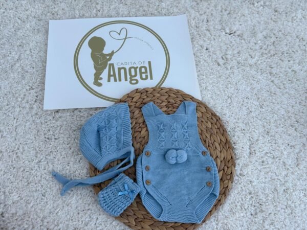 La ranita con tirantes en color azul presenta un delicado dibujo trenzado en la parte delantera y un divertido detalle de pompones, además de botones laterales de madera que aportan comodidad y estilo. La capota a juego, confeccionada con el mismo punto trabajado, completa este conjunto con un aire clásico y entrañable.