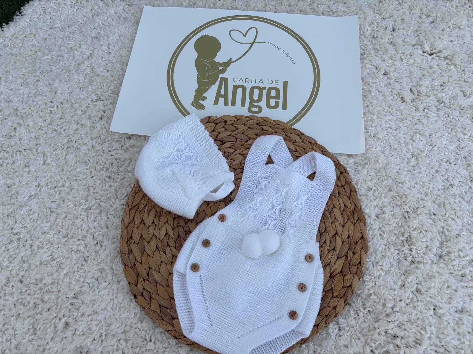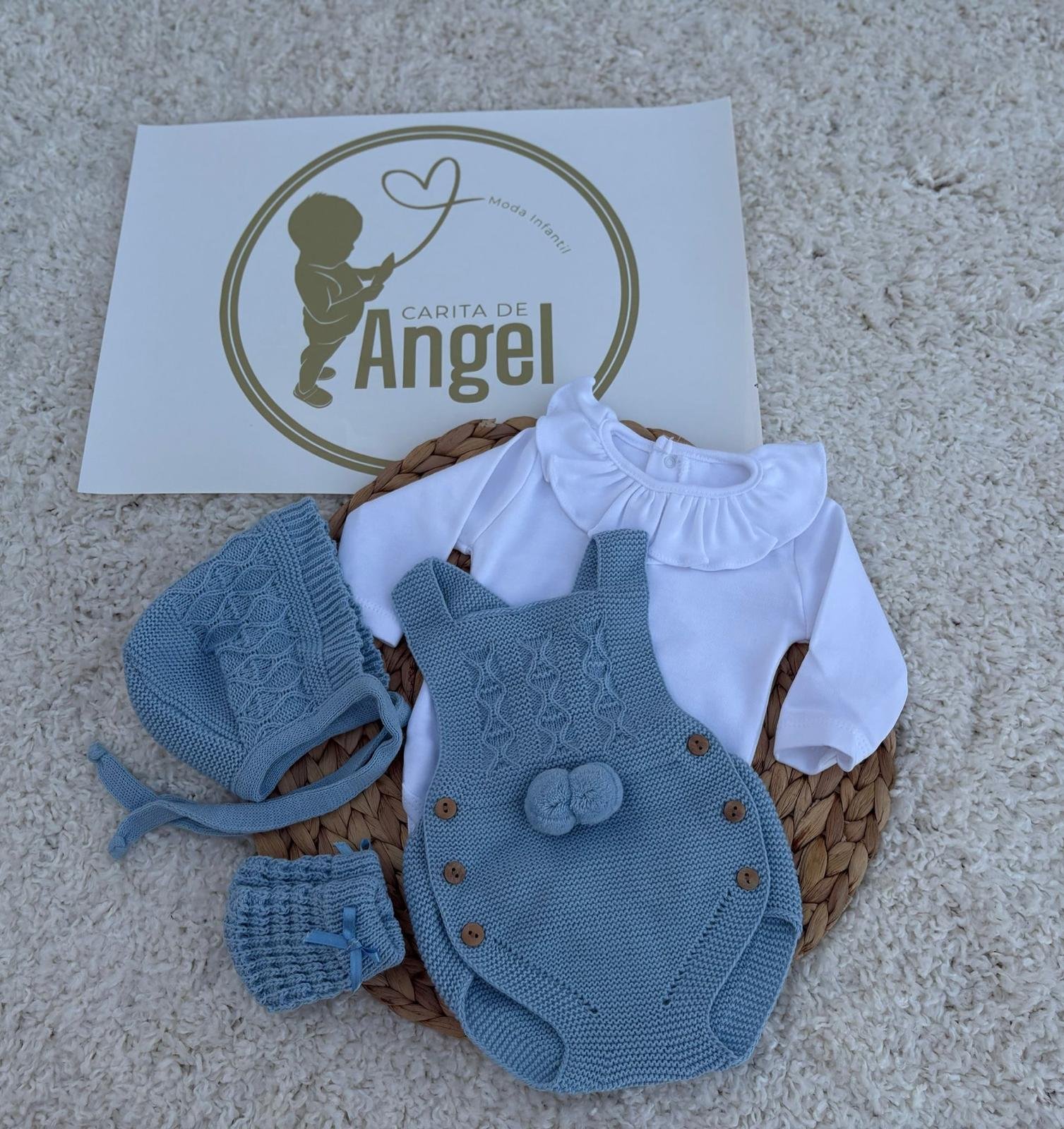 La ranita con tirantes en color azul presenta un delicado dibujo trenzado en la parte delantera y un divertido detalle de pompones, además de botones laterales de madera que aportan comodidad y estilo. La capota a juego, confeccionada con el mismo punto trabajado, completa este conjunto con un aire clásico y entrañable.