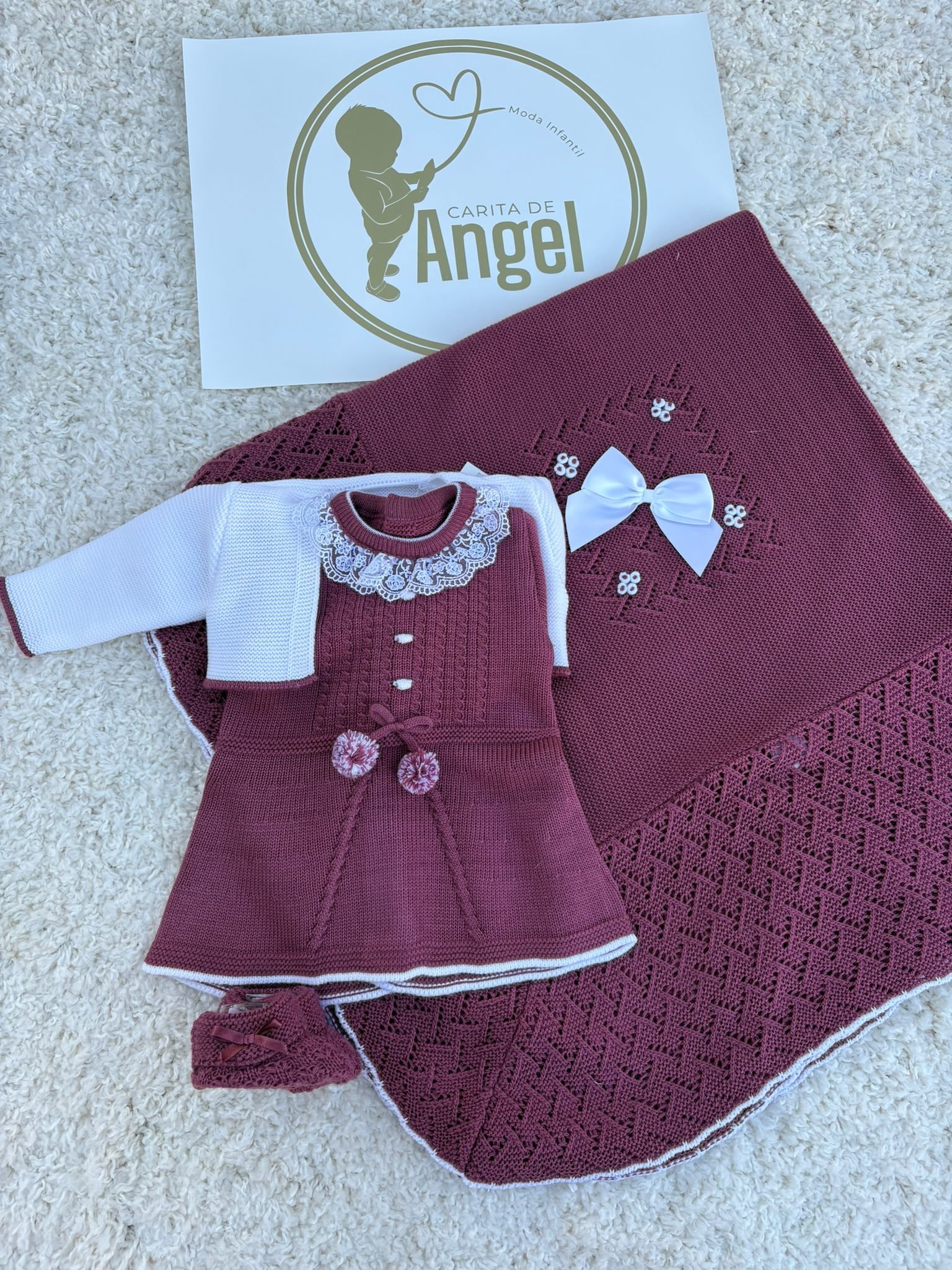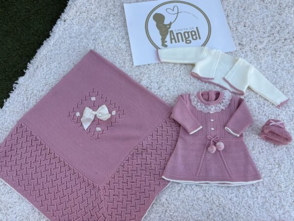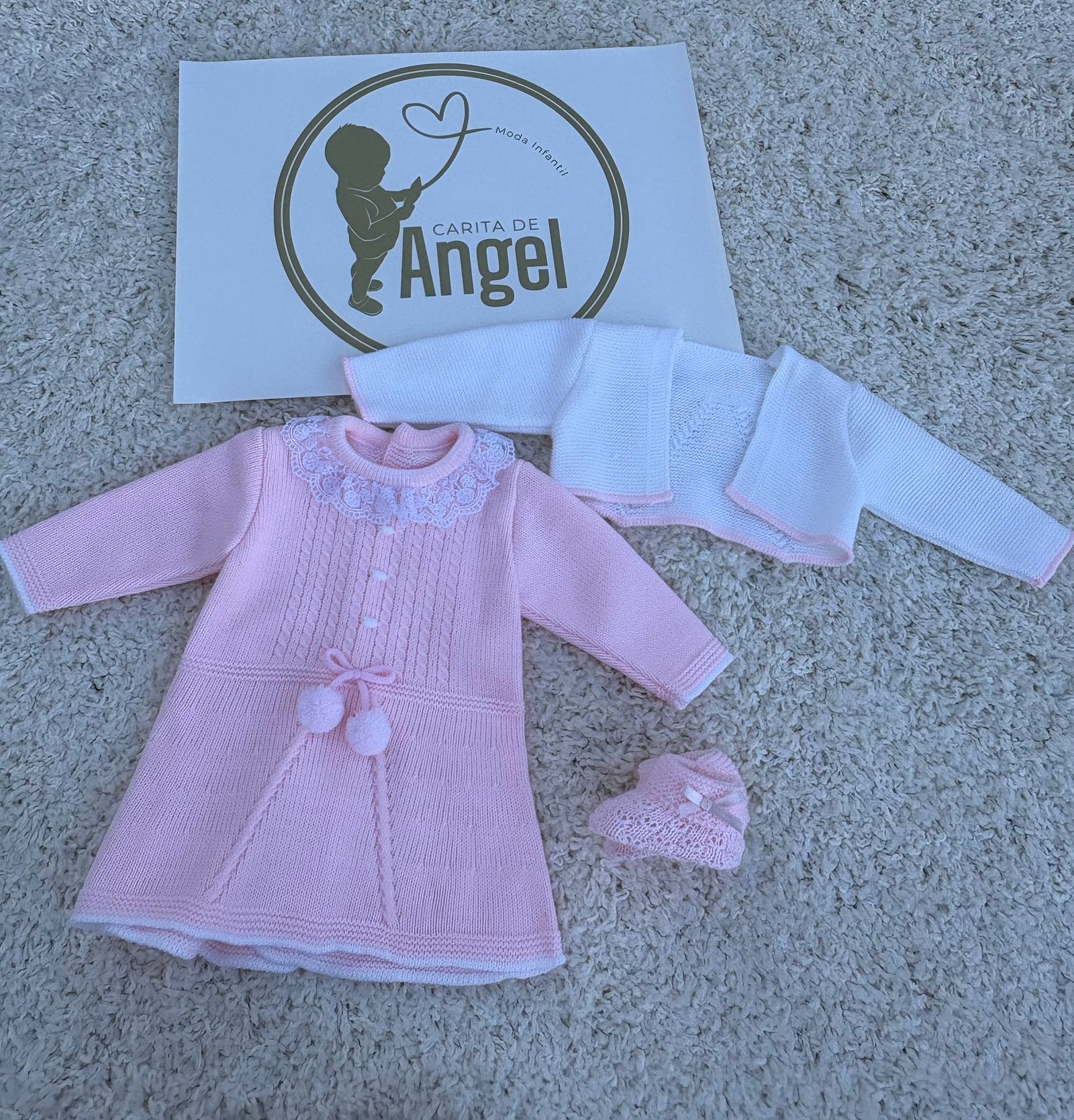 Incluye un vestido de manga larga confeccionado en punto suave y delicado, con un diseño de trenzado en la parte delantera, detalle de lazo con pompones y un precioso cuello de encaje que aporta un aire romántico. Se acompaña de una chaquetita de punto a juego, ideal para combinar y mantener al bebé abrigado sin perder comodidad.
